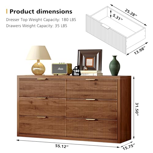 【Dimensions & Storage】The wooden dresser measures 55.12″ W x 15.75″ L x 31.5″ H.This chest of drawers comes with 6 arge drawers 25.28″ W × 13.98″ D × 45.31″ H , providing ample storage for your essentials while keeping them easily accessible. Enhance your bedroom decor while ensuring your necessities are within reach.Suitable for various…
