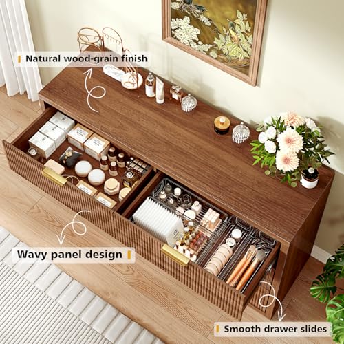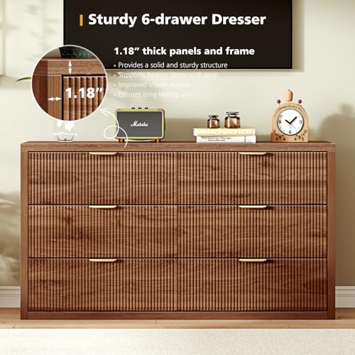 55.12″ Modern Chest of Drawer, 6 Deep Drawers,Clothes Organizer,Large Storage Cabinet for Living Room, Bedroom,Dresser TV Stand, Wood Drawer Organizer for Living Room, Hallway, ​​Walnut​