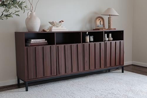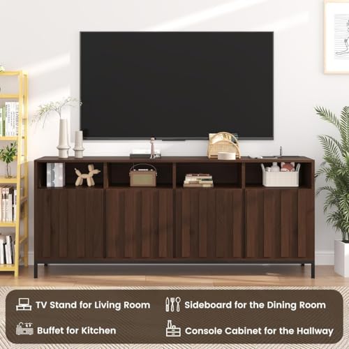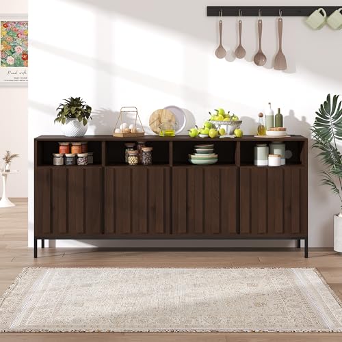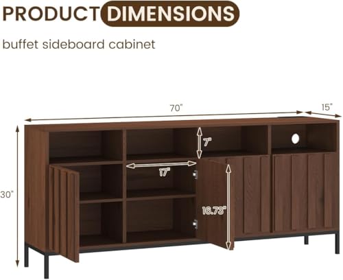 COCO DESIGN 70″ Buffet Sideboard Cabinet with Fluted Panel Doors, Large Credenza Console with Power Outlet & Adjustable Shelves, Modern Storage Cabinet for Kitchen & Living Room, Walnut