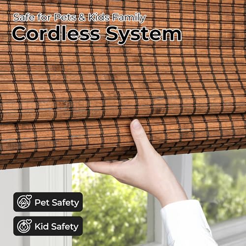 Cordless Bamboo Roman Shades for Windows, 100% Blackout Backing Fabric for Light Blocking, 23″ W × 64″ H – Penang Teak