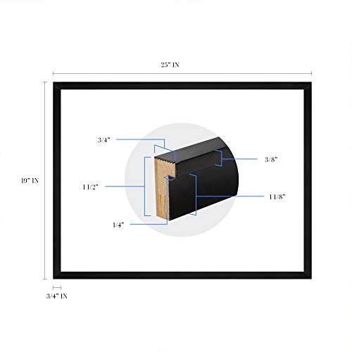 • READY TO HANG: This high-quality frame displays art beautifully in almost any environment. The frame is made out of poplar wood with a black matte finish. Overall dimensions of the frame with artwork is 19 x 25 inches. The frame profile is 1.5 inches high and 0.75 inches wide. To protect artwork, we use high-quality, lightweight, shatter-resistant frame-grade acrylic. Frames arrive ready-to-hang, preinstalled with hanging hardware.