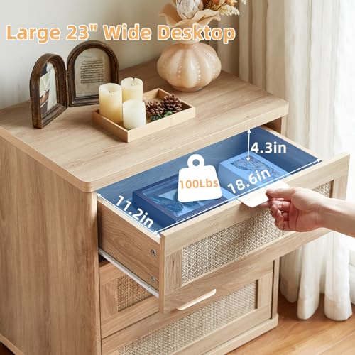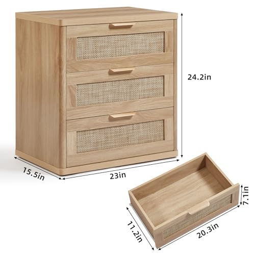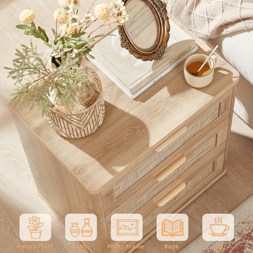 LEYAOYAO Rattan Night Stand Set of 2 with Drawers, 23″ Large 3 Drawer Boho Nightstand, Natural Wood Bedside Table Storage Cabinet, Bed Side End Tables Dresser for Bedroom, Living Room, Hallway, Closet
