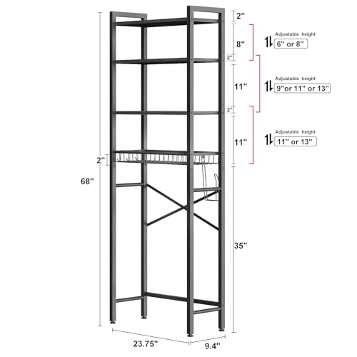 • [Utility Design] Our over the toilet storage shelf features three open shelves and 1 storage basket, along with 3 removable hooks and a toilet paper holder, providing ample storage space. The compartment below the basket helps organize your toilet, washing machine, dirty clothes cart, and other large items.