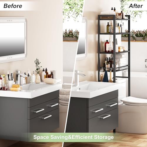 [Utility Design] Our over the toilet storage shelf features three open shelves and 1 storage basket, along with 3 removable hooks and a toilet paper holder, providing ample storage space. The compartment below the basket helps organize your toilet, washing machine, dirty clothes cart, and other large items. [High-Quality & Style Go Beyond] 4-Tier-over-the-toilet storage…