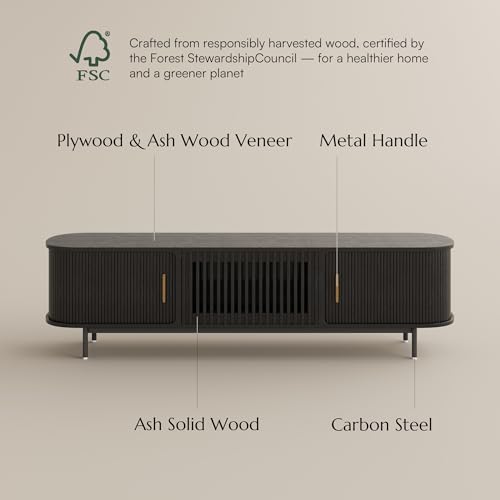 - Sleek Curve Round Edge: The smooth curved round edge tv stand with storage, rolling slatted door solid wood tv console, soften the look of the streamlined frame, provide an environment safe for the little ones. Its aesthetic appeal makes it suitable for both living rooms and bedroom