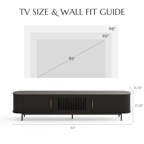 POVISON Fully-Assembled Mid Century Modern TV Stand for 75+ inch TV, Sliding Door Entertainment Center with Storage, Wood TV Console, Media Console for Living Room Bedroom(Black, 94.49″)
