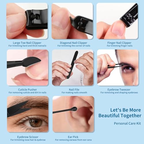 - 5. Complete Kit: Includes curved fingernail clippers, bevel fingernail clippers, toenail clippers, a steel nail file, slant-tip tweezers, cuticle scissors, cuticle pusher, ear pick, and a durable travel case for organized grooming on the go.