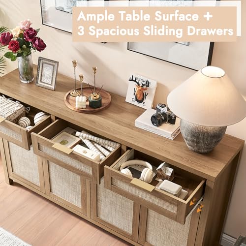 Rattan Sideboard Buffet Cabinet, Boho Storage Cabinet with Adjustable Shelves, Farmhouse Credenza Coffee Bar Cabinets with 4 Doors & 3 Drawers for Living Room, Hallway & Kitchen